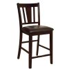 This transitional style counter height chair can enhance any dining room. Finished in a deep espresso, it is made of solid woods and veneer and offers a comfortable leatherette seat.
